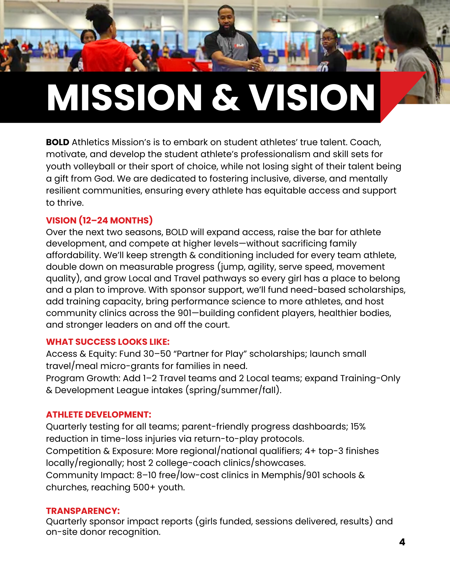 This section outlines measurable growth goals, scholarship funding objectives, and athlete development benchmarks, positioning the organization as both performance-driven and accountable.