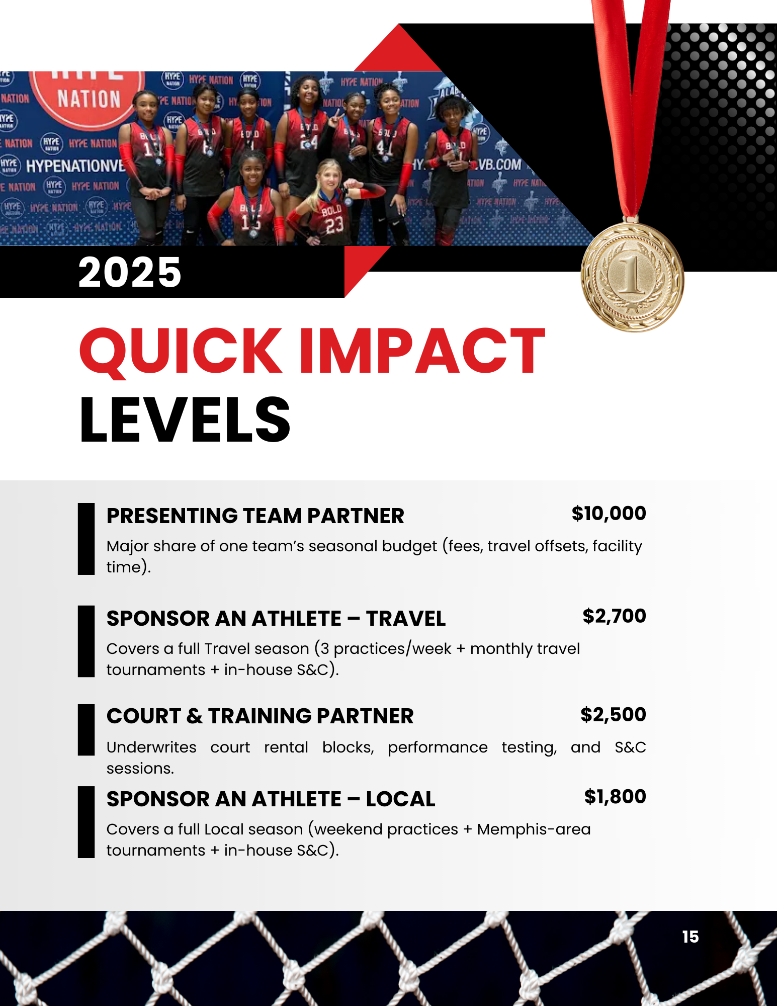 Investment levels were organized to allow sponsors to align their contribution with specific outcomes — from team sponsorship to direct athlete support.