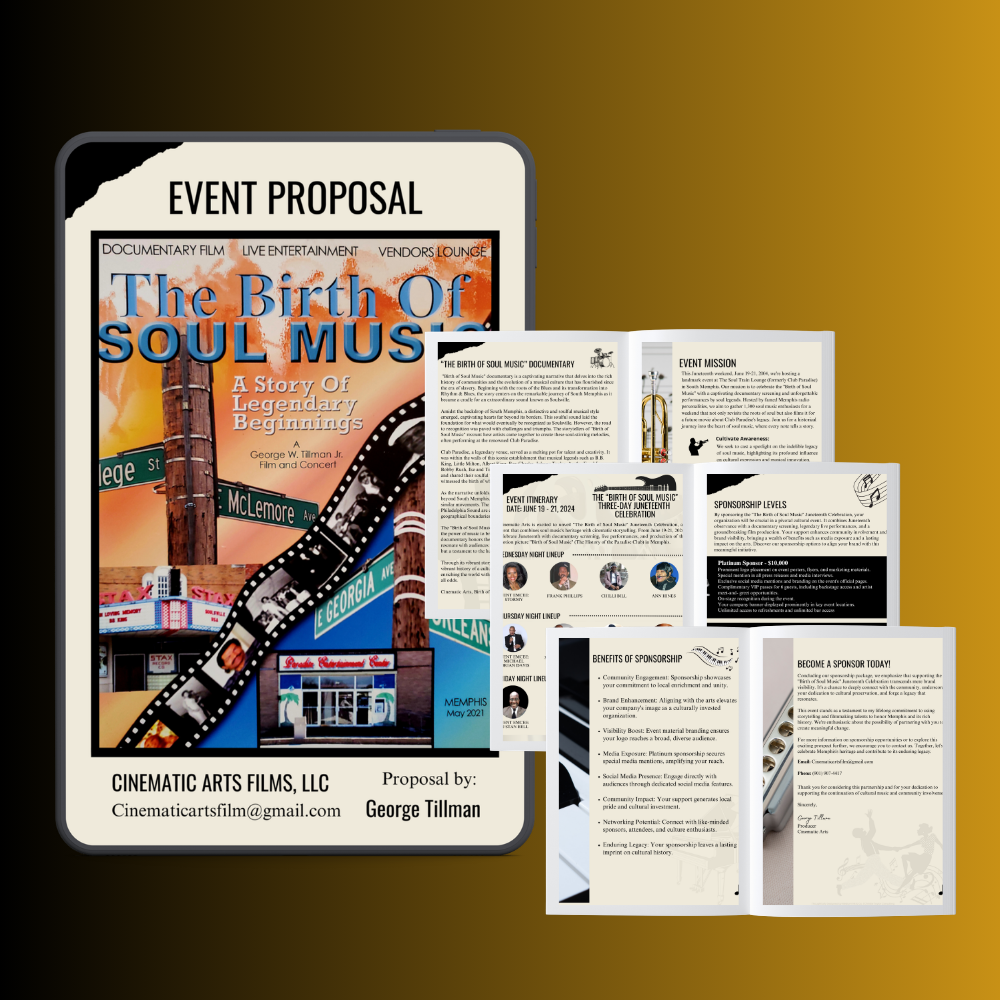 For George Tillman and Cinematic Arts Films, we developed a comprehensive sponsorship proposal for The Birth of Soul Music, a Juneteenth celebration and documentary experience honoring the legacy of Soulsville and the cultural roots of South Memphis.