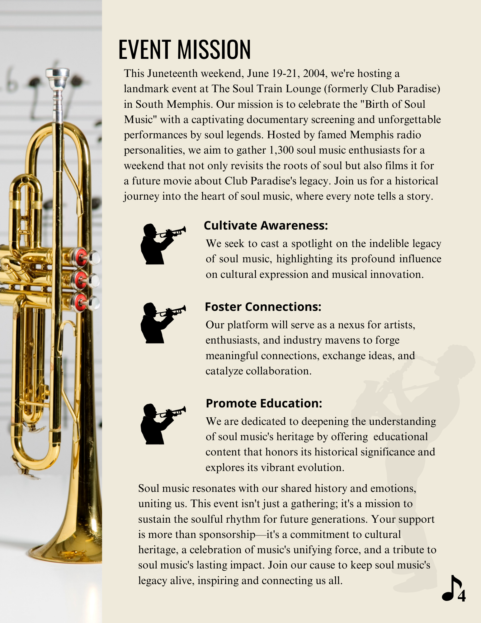 The mission section articulates awareness, education, and connection, allowing sponsors to align their investment with meaningful cultural impact.